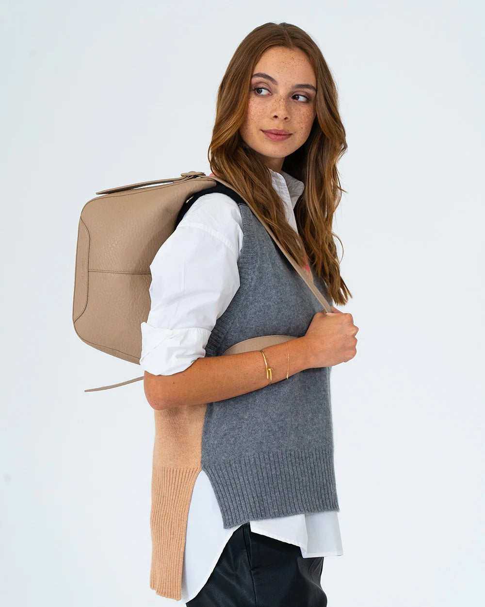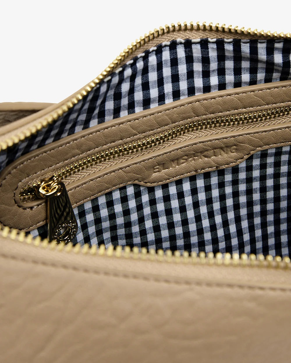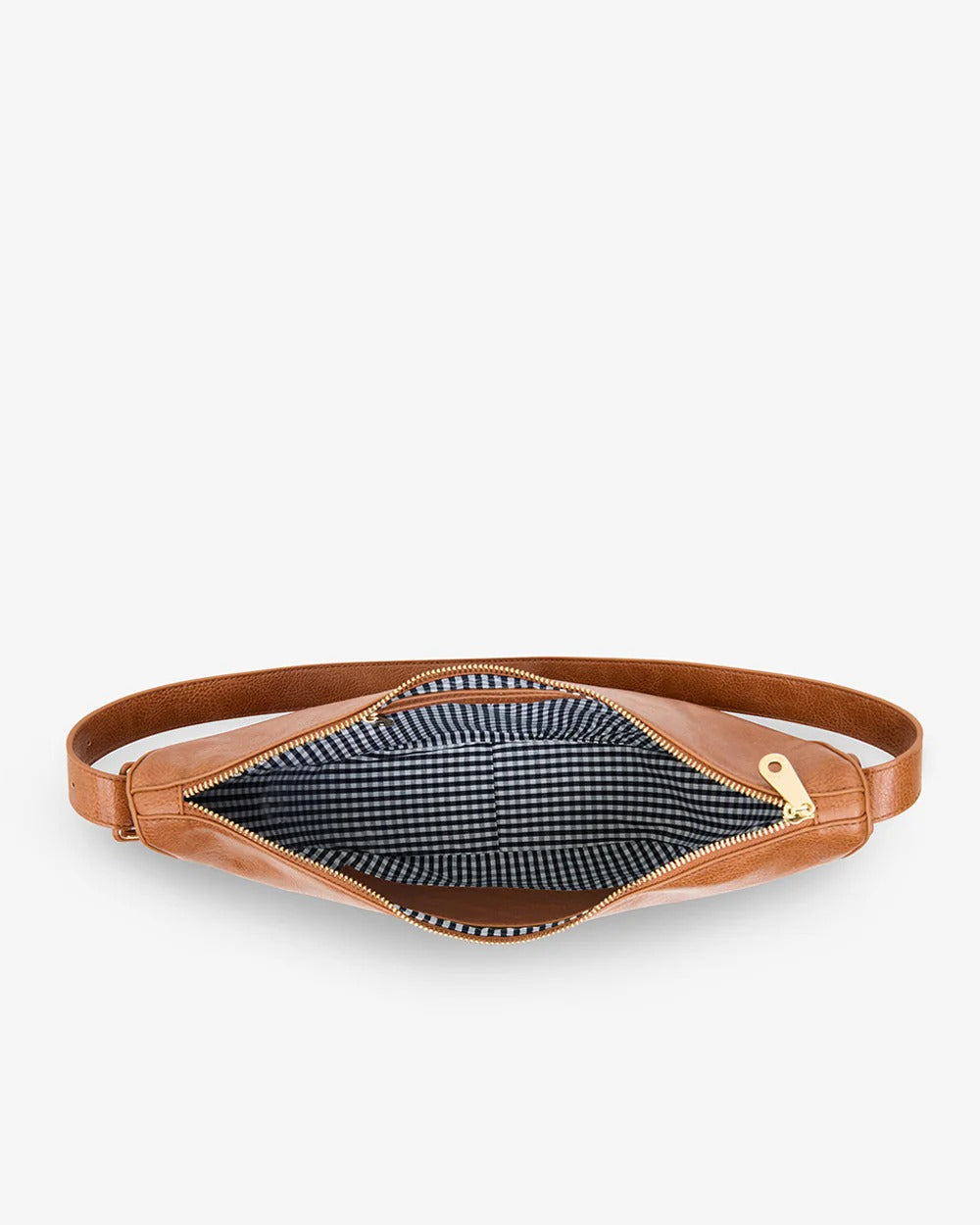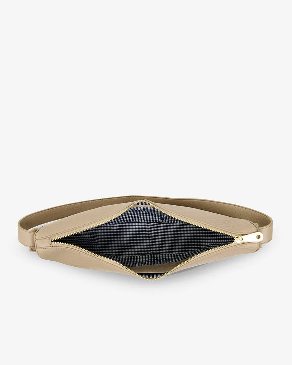 The Elms+King Barton Shoulder Bag is made from premium 100% recycled polyurethane and features blue & white gingham lining. The Barton Should Bag has an attached shoulder strap, that is adjustable by a buckle attachment on one side. The top zipper opens to reveal an ample centre compartment with zippered pocket and an open top slip pocket (to fit a large phone).