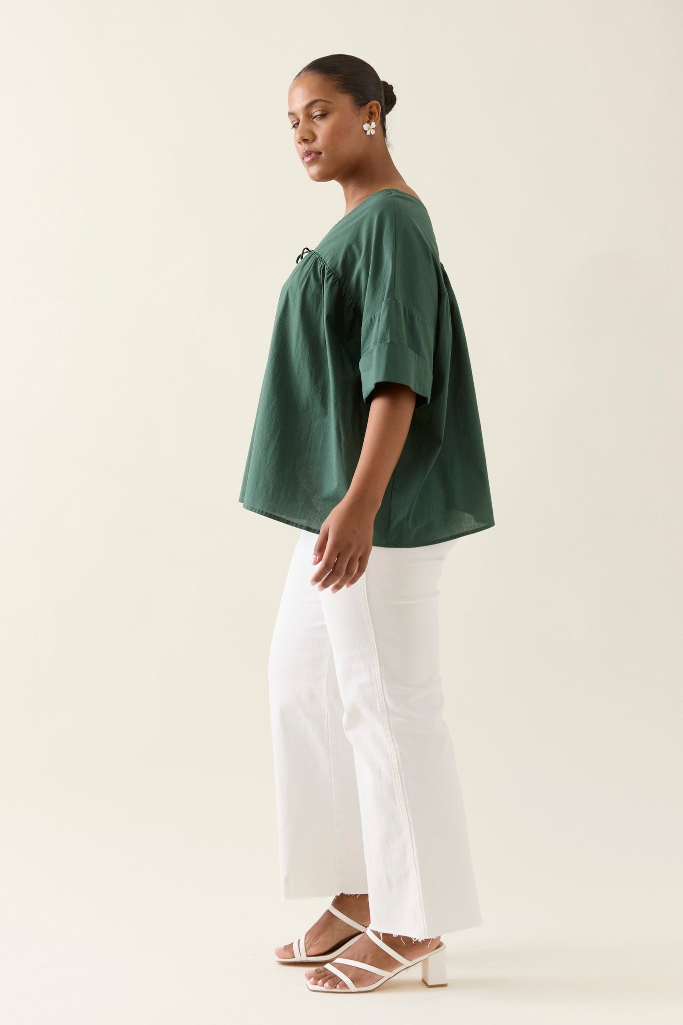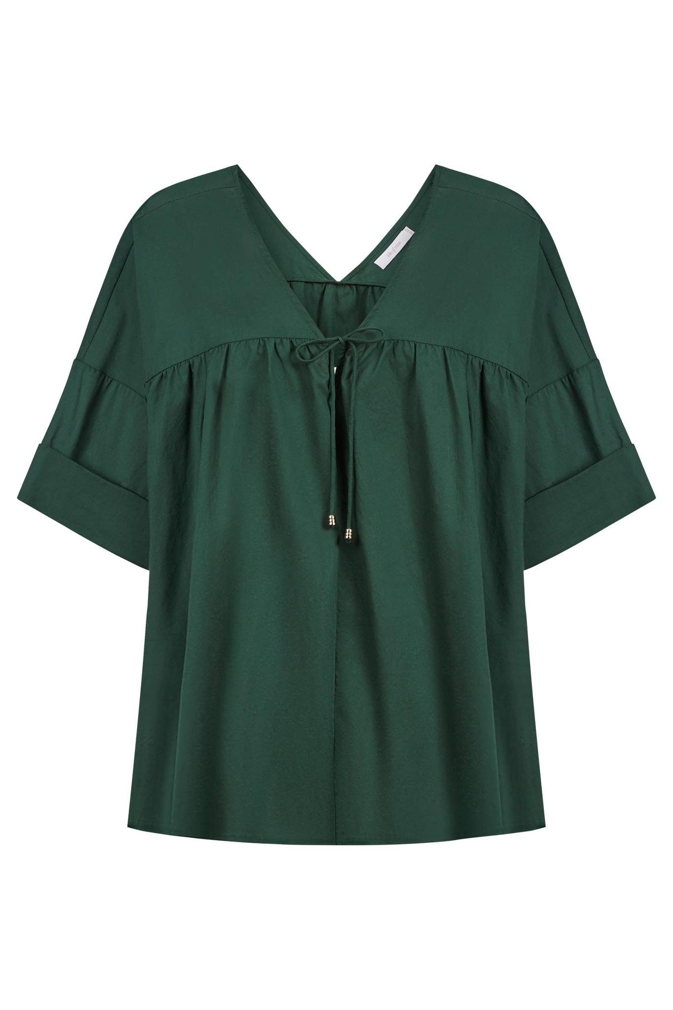 Designed for comfort and movement, the Aurora Relaxed Top features a flattering V-neck at front and back, a dropped sleeve with cuff, and neck ties finished with gold beads. The cotton voile fabric gives it an airy feel.