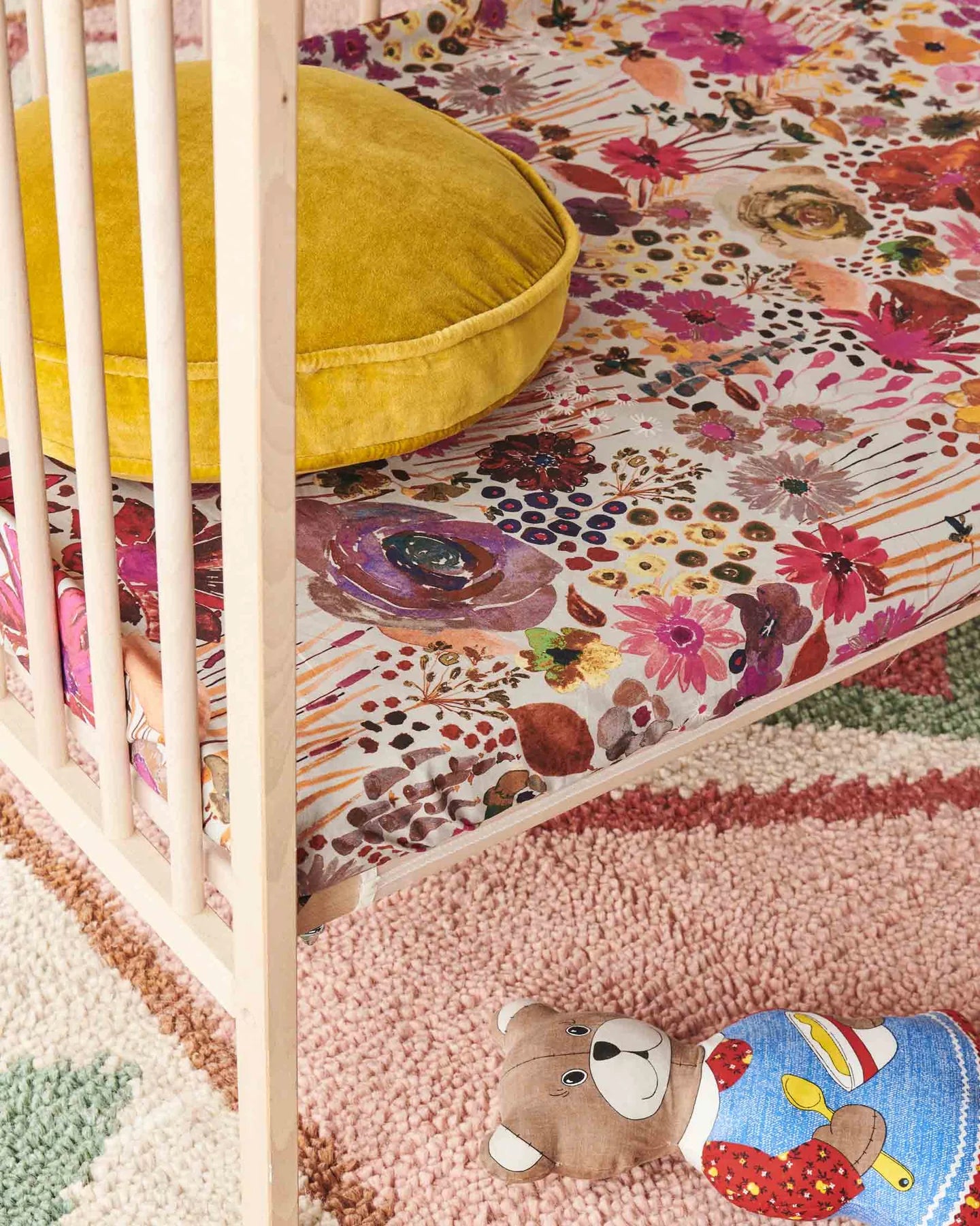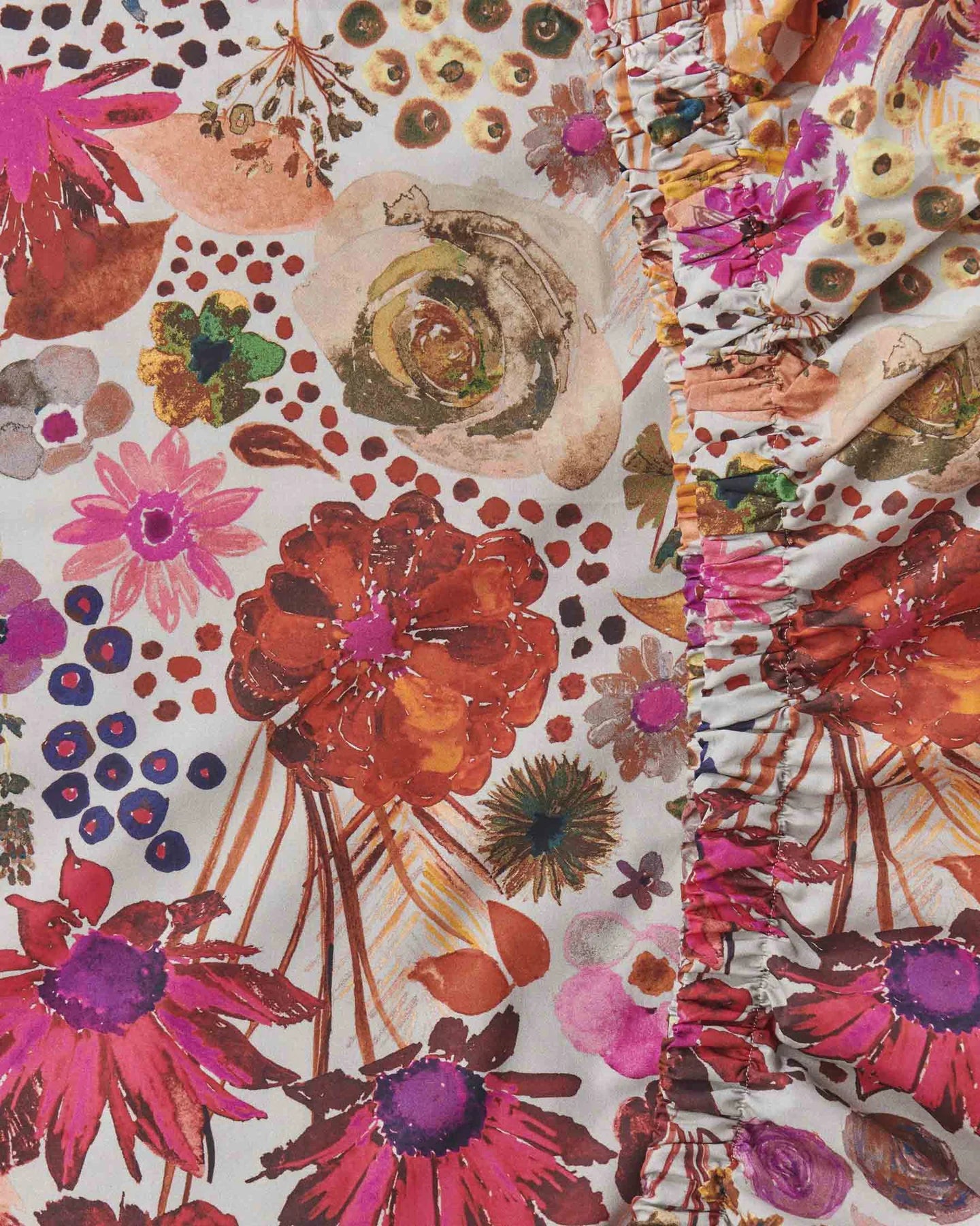 The Field Of Dreams Staples organic cotton fitted sheet features Kip&Co's most iconic hand painted floral print in pinks and purples on a silver grey base.