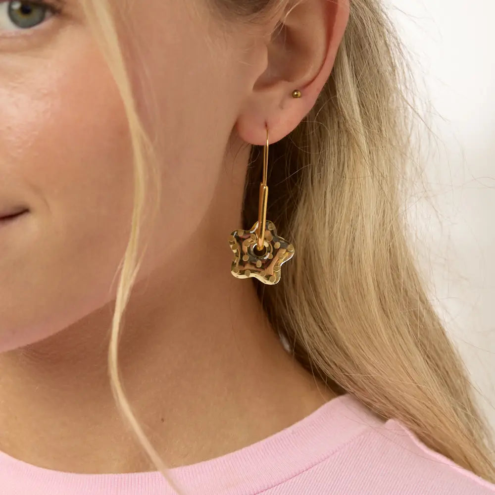 A delicate dotty flower hangs from a long oval hoop, creating a statement that’s simple enough to wear on its own but effortlessly eye-catching. Lightweight, waterproof, and perfect for everyday style.