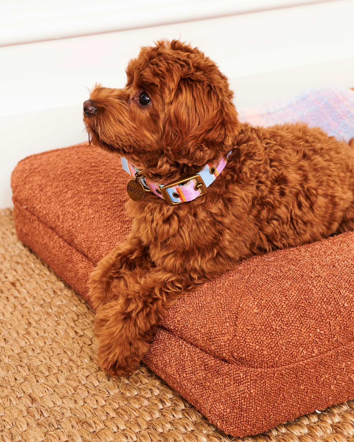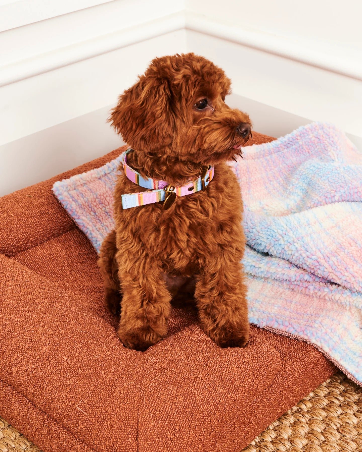 Happy days ahead for our four-legged friends with the coolest dog collars on offer. Our Fez Stripe Dog Collar features a multicoloured chunky stripe pattern in pinky purple and cream with slim stripes in khaki green, yellow, mustard, blue and red. Available in three sizes, and pair with matching lead and bed.