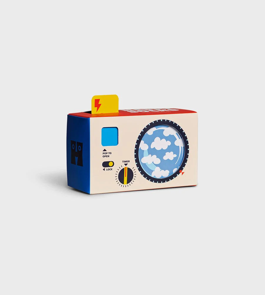 Lights, camera, action! This box can be used as a toy camera once the socks are on the kids' feet. Featuring cloud socks, road trip socks and snail socks.