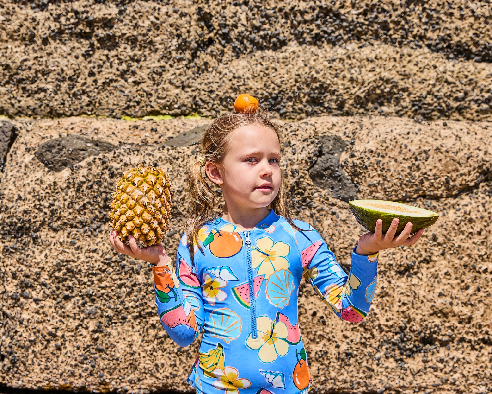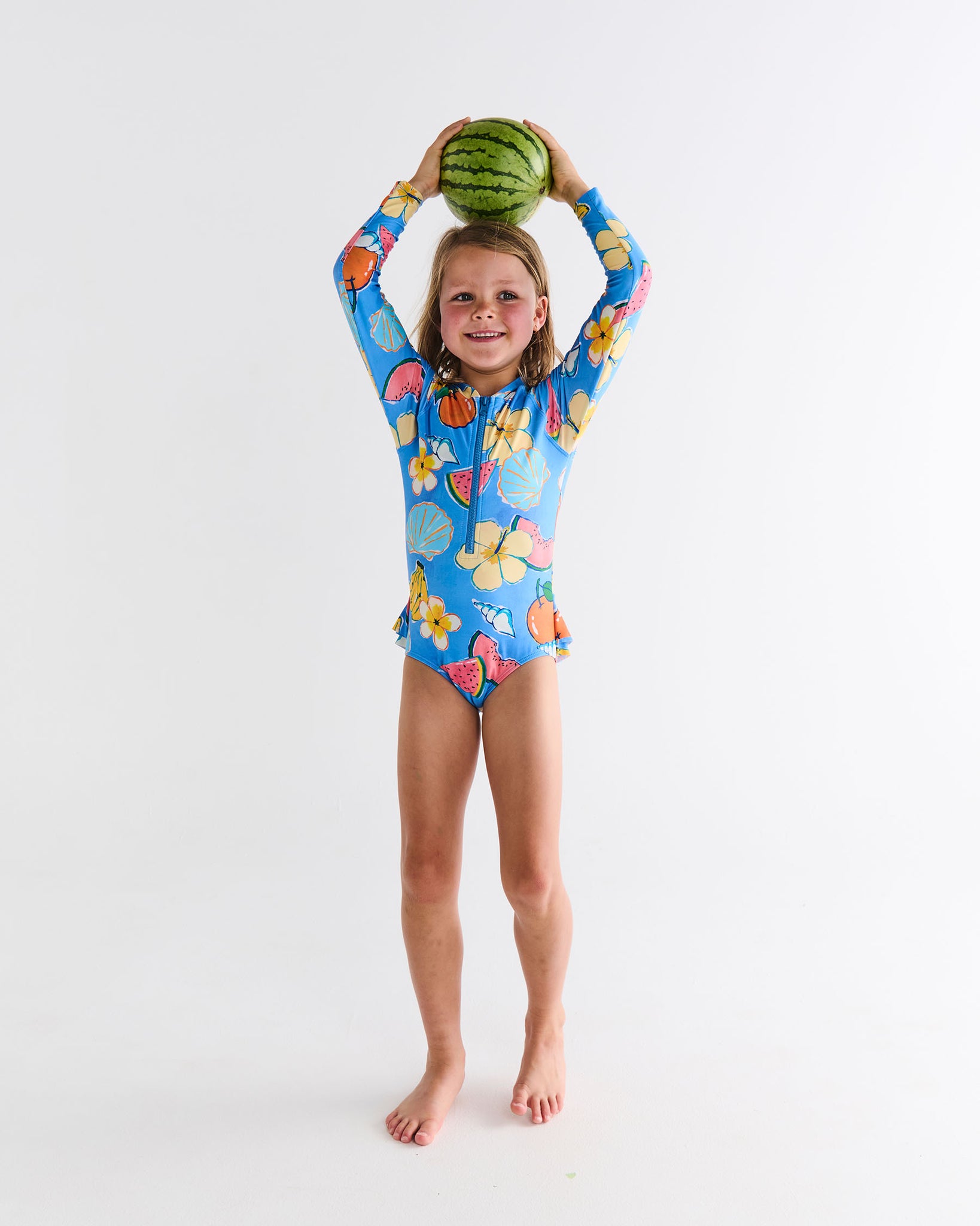 Beach days, pool parties, and endless cannonballs, our Paradise Found Long Sleeve Bathers are made for it all! With recycled polyester and spandex for the perfect stretch, plus UPF 50+ sun protection, this zip-up beauty is comfy, colourful, and ready for every splash-filled summer adventure. This best-selling style features hand-drawn tropical fruits, flowers and seashells on a blissful blue base.