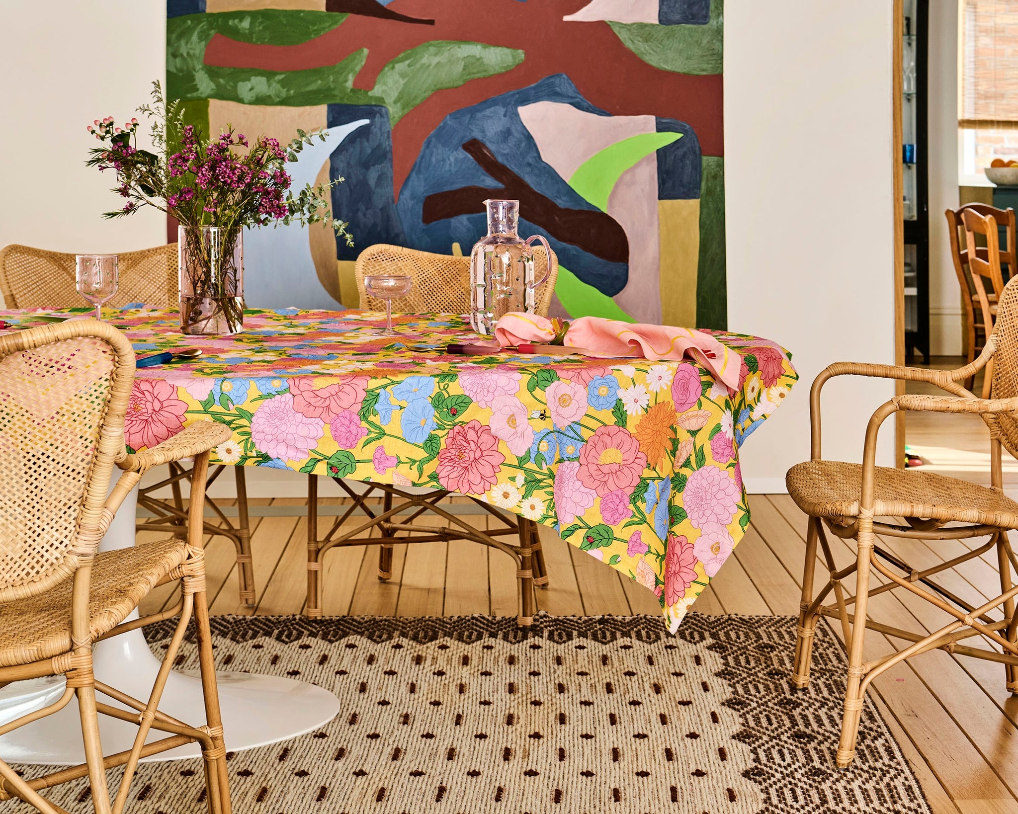 Celebrate long, sun-soaked lunches and effortless summer dining with the Follow The Sun Yellow Tablecloth. Made from a soft linen-cotton blend, it features hand-drawn florals in shades of pink, orange and cornflower blue, dotted with friendly little bees and lady beetles on a radiant yellow base. Bold yet cheerful, it brings warmth, colour, and playful personality to every meal. Pair with our lovely range of napkins, cutlery, and tableware to create a table that’s perfect for casual lunches or golden-hour dinners with friends.
