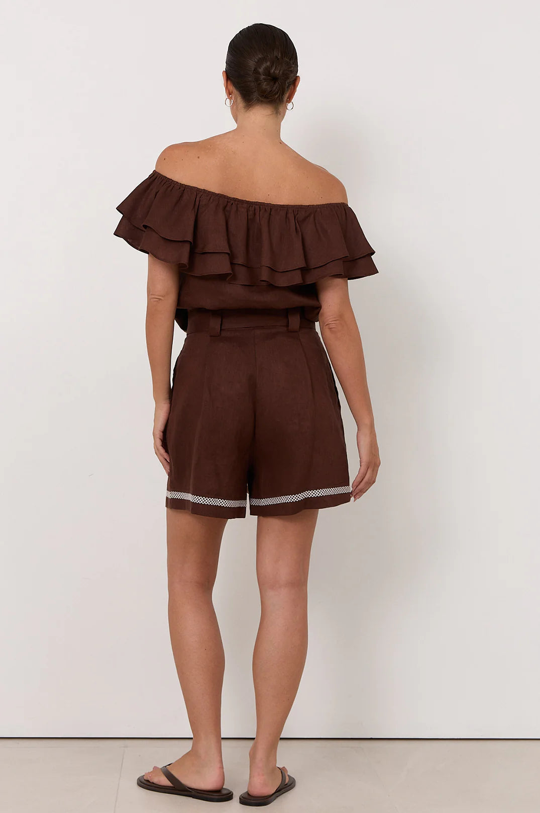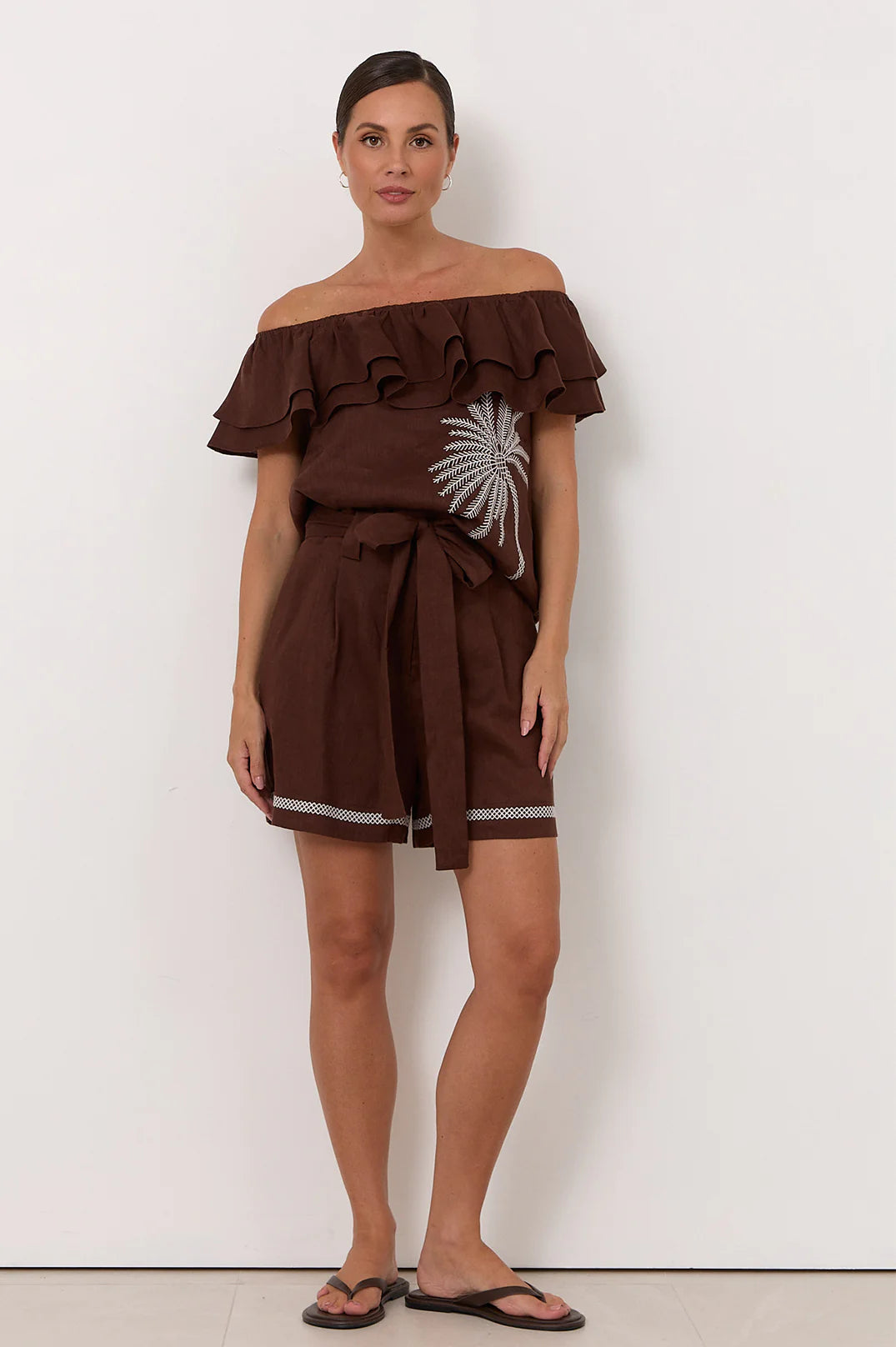 The Renee Linen Short in Chocolate is crafted from 100% linen, it features a hook-and-bar closure with zip, belt loops and an optional waist tie. Finished with pleats, contrast embroidered trim and side seam pockets.