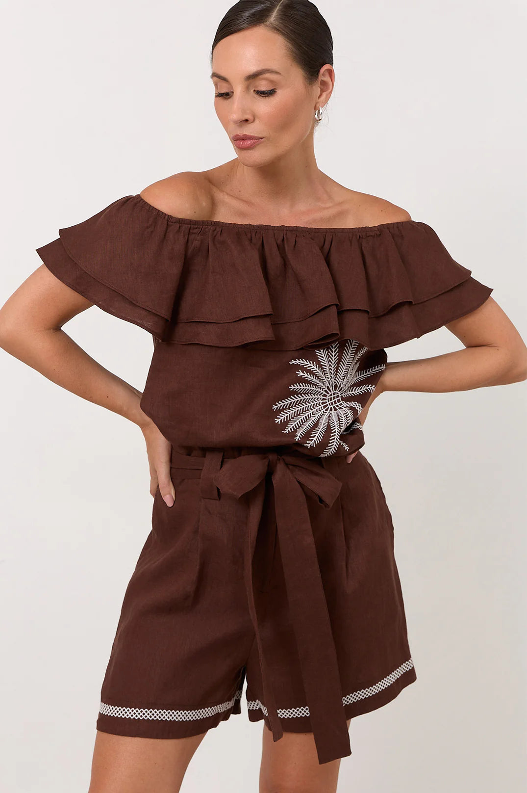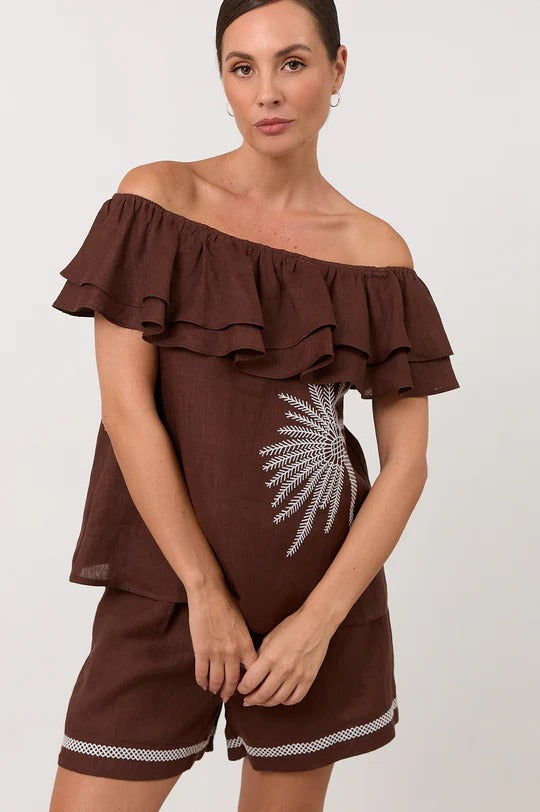 The Serena Linen Frill Top in Chocolate features an elasticised neckline with layered frill detailing and contrast embroidered palm motifs. This style can be worn off the shoulder, on the shoulder or as a one-shoulder style. Crafted from 100% linen.